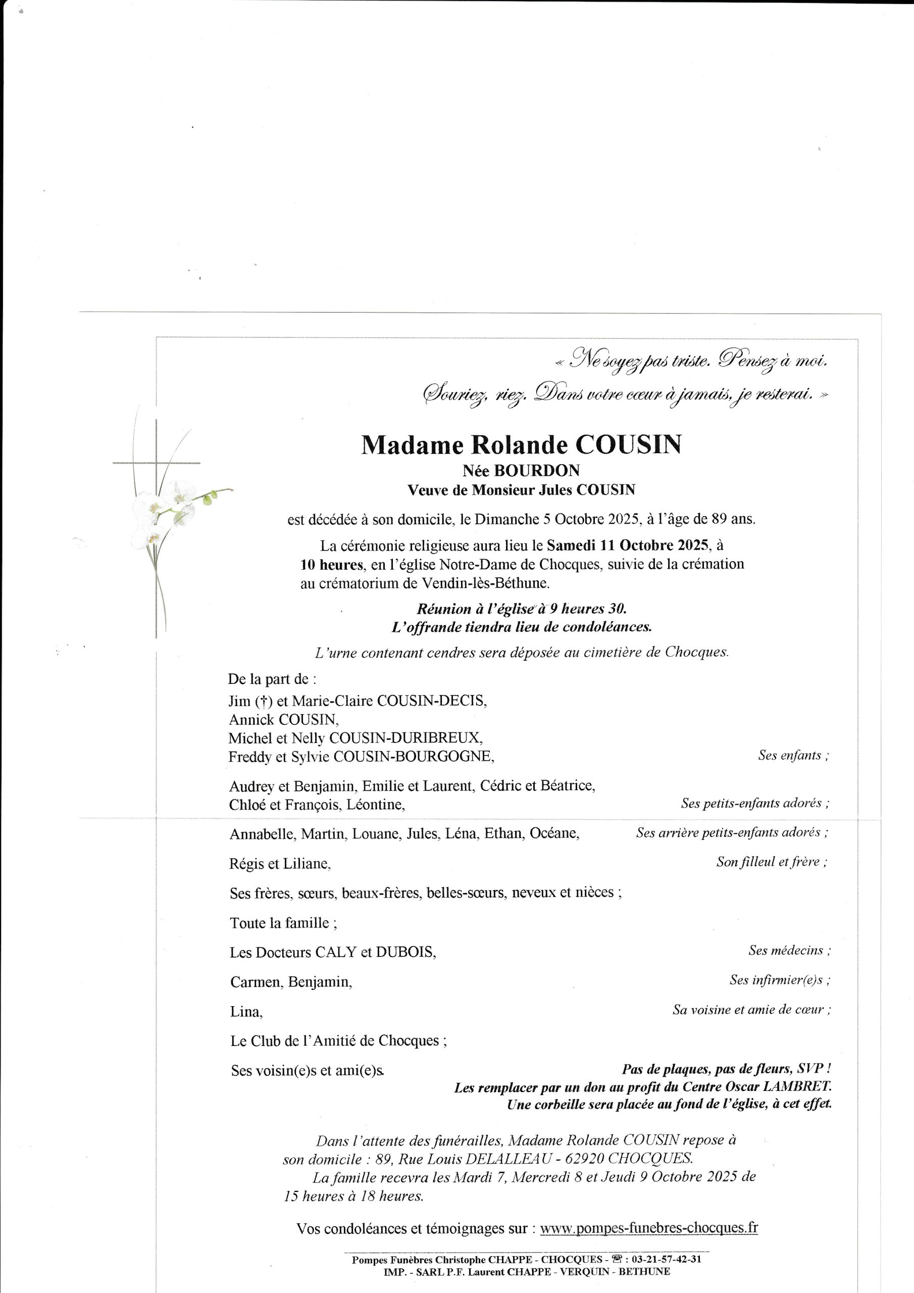 C’est avec beaucoup de peine que j’ai appris le décès de votre maman qui restera pour moi mamie Chocques…. J’imagine votre douleur dans cette période difficile, je penserai à vous et mes prières vous accompagneront pour lui dire un dernier aurevoir, ne pouvant être présente à vos côtés. Elle sera toujours avec vous dans vos coeurs et vos souvenirs. Je vous présente mes sincères condoléances.